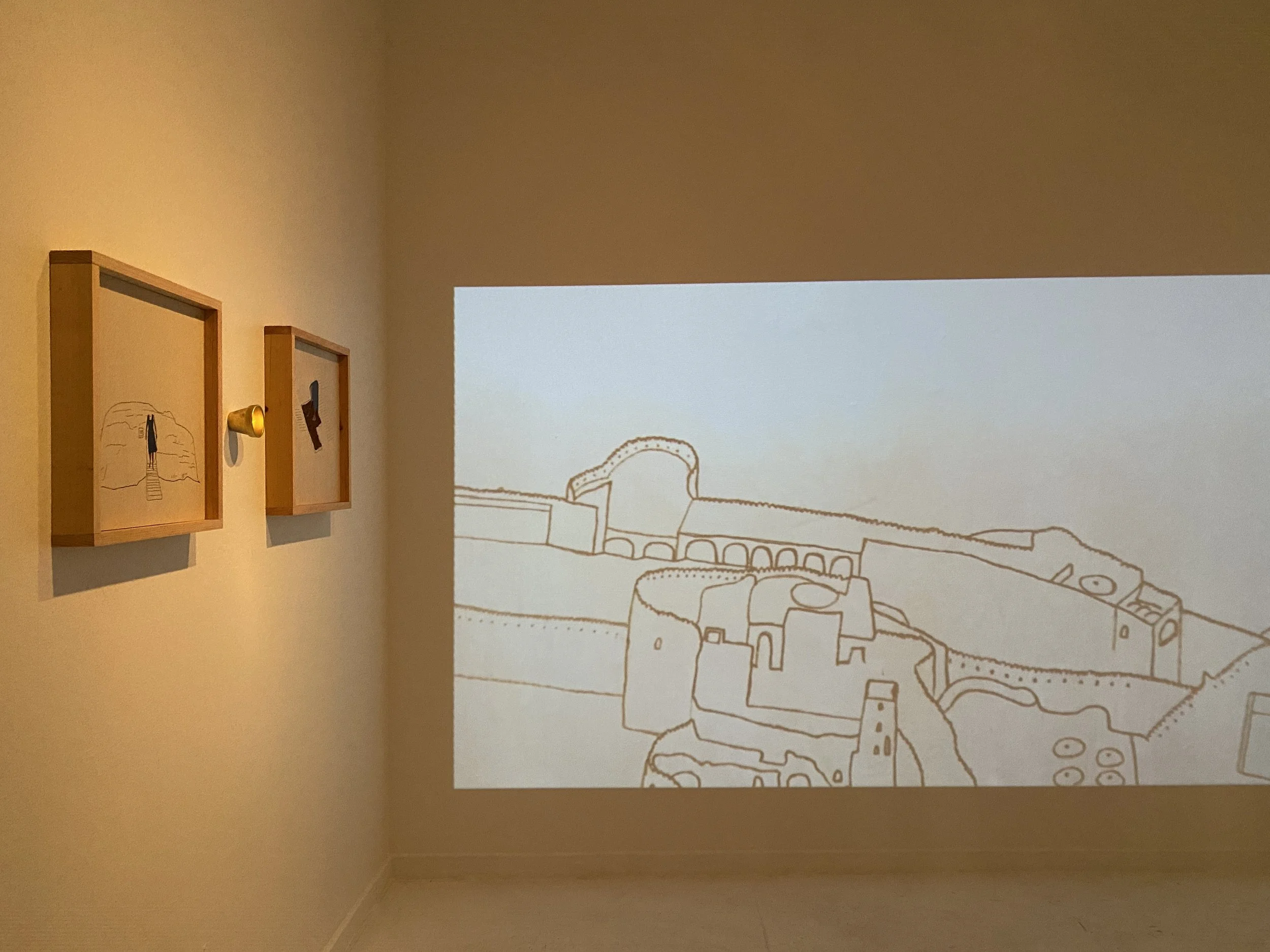 To imagine a world where this pilgrimage would be possible, I began by burning the outlines of some of the architecture onto wood, creating environments for the stop motion. Many of the reference images I used to make these drawings are what I think of as colonial material - photos from a Danish archeology student’s blog, aerial images by a Swiss photographer taken just months before the Revolution in 1978, video footage of the sites from ‘The Human Studies Film Archives’ at The Smithsonian Institution, etc. I think of these mixed media works - and this process - as an act of reclamation.
